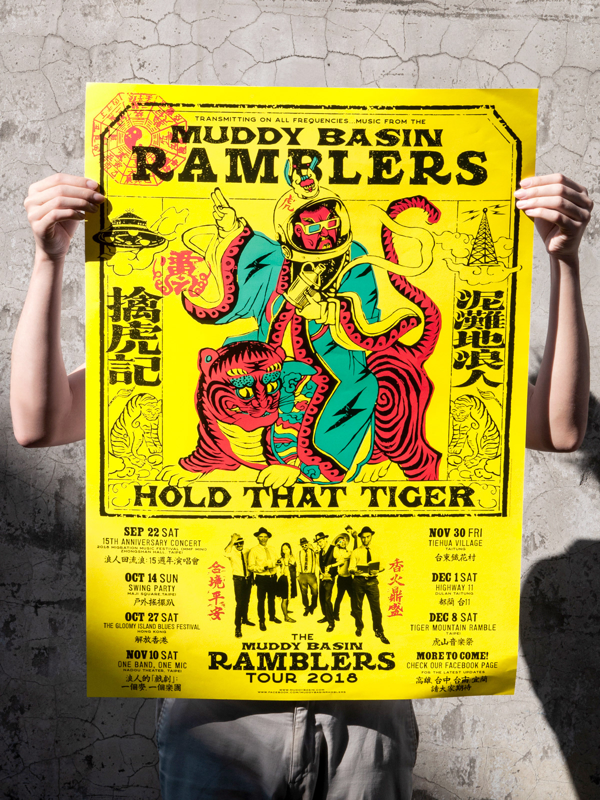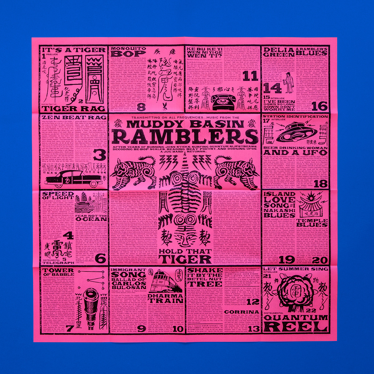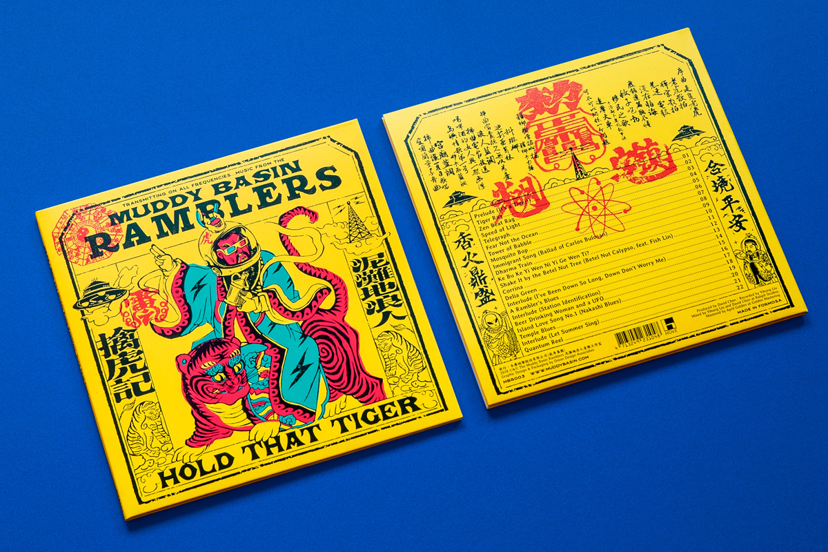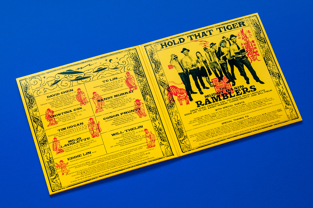 依據(jù)藝術(shù)家徐冰「新英文書法」,將英文Typography加上漢字構(gòu)成右側(cè)樂團(tuán)名 (The Muddy Basin Ramblers) 與左側(cè)專輯名 (Hold That Tiger),再造似字非字、似圖非圖的畫符美感,放大版的平安符由8道步驟摺為六角平安符並包裹光碟。