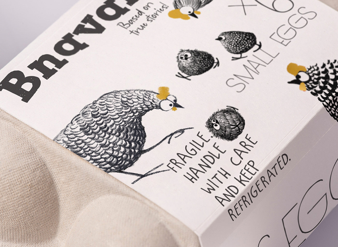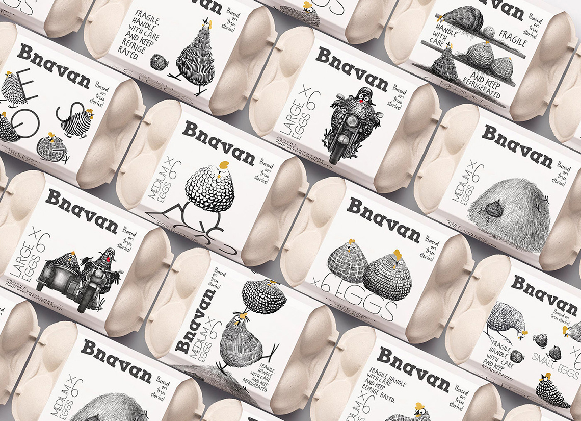 Bnavan蛋類(雞蛋、鵪鶉蛋)包裝設(shè)計,將雞或鵪鶉的形象通過繪畫、黑白色形式表現(xiàn),狀態(tài)擬人化、且惟妙惟肖。瞬間變得可愛。