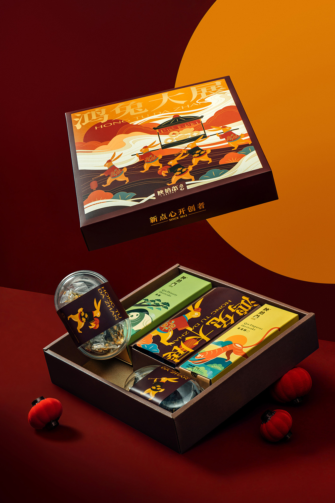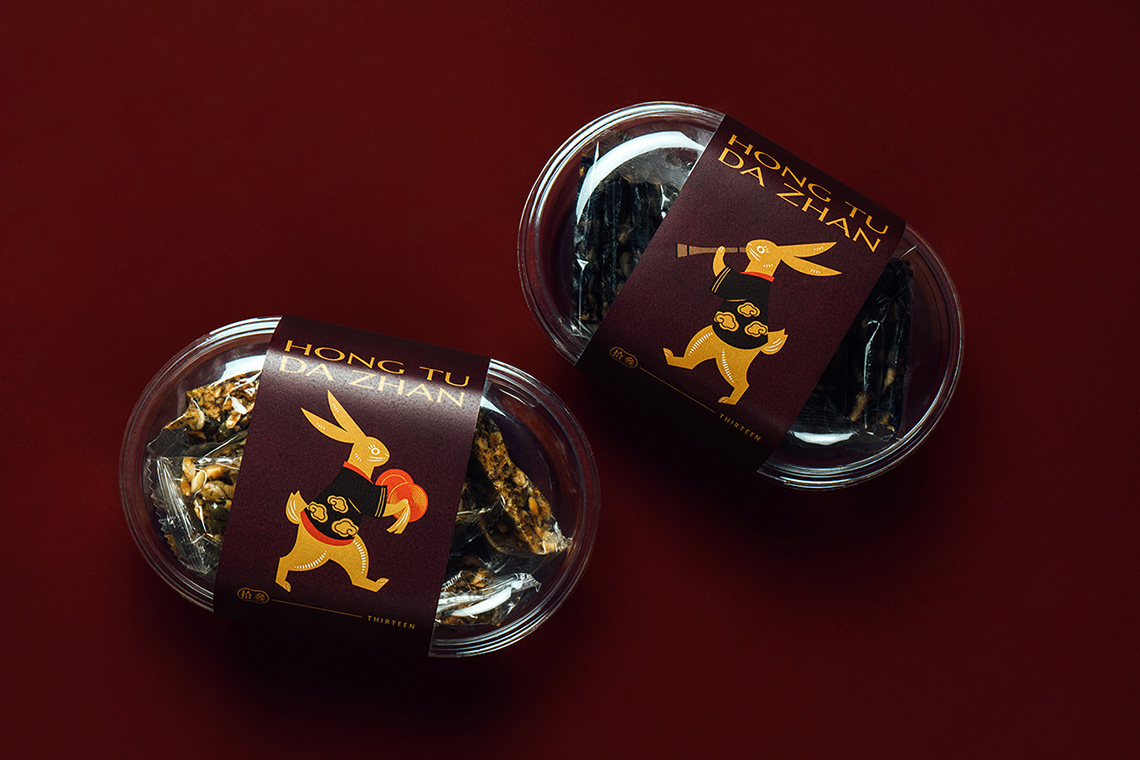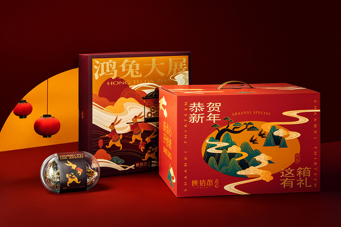 以橘紅色為基底的外盒設(shè)計(jì),透出滿滿的暖意與喜氣,數(shù)字五有著福的諧音,也包含圓滿的含義,五只免子穿著可愛服飾,扛著五財(cái)敲鑼打鼓的前進(jìn),加上五入的內(nèi)裝,代表此禮蘊(yùn)含著(送禮送五入,五路財(cái)神入厝住,)的吉祥之意的背景以線性與色彩的局次堆疊,表現(xiàn)出新年的順風(fēng)順?biāo)?,加上以陜西?dú)特文化的剪船藝術(shù)風(fēng)格刻畫的福免,充滿著喜氣陜西風(fēng)格新年禮盒,愿新的一年,你我都錢兔似錦、鴻兔大展,癸卵兔新年快樂!